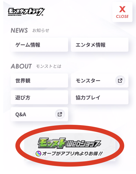 ⑦「MENU」の中にある「モンストWebショップ」を選択