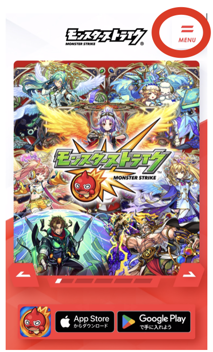 ⑥モンスト公式Webサイトに移動し右上の「MENU」を選択