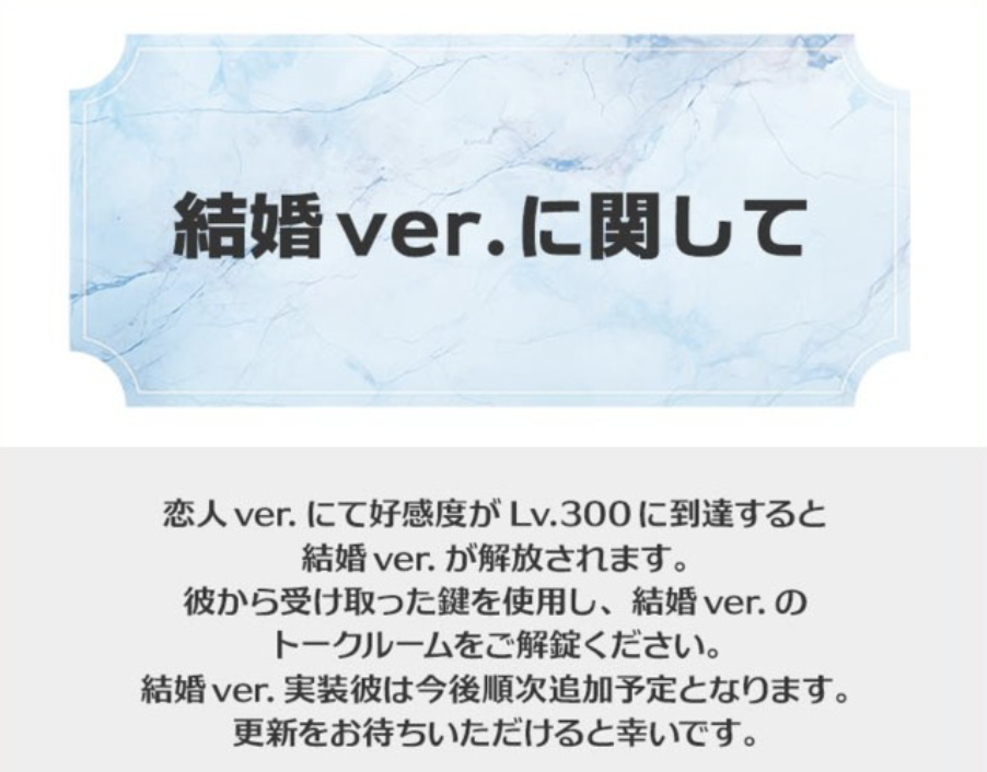 これまでは「友達編」「恋人編」までしかプレイできなかったけど、恋人編の先を楽しめる、「結婚ver(結婚編)」が追加されました。