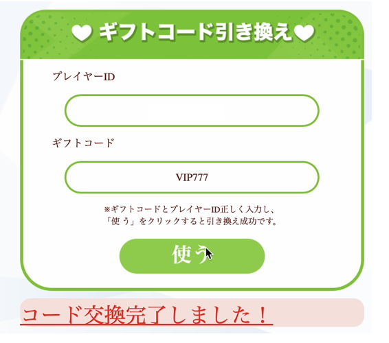 プレイヤーIDとギフトコードを入力して「使う」をクリックします。