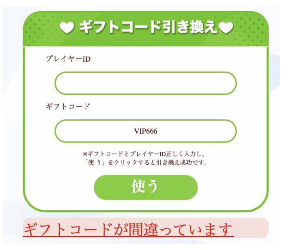 一方で間違ったコードや、使用期限が切れたコードを入力すると「ギフトコードが間違っています」と表示されます。