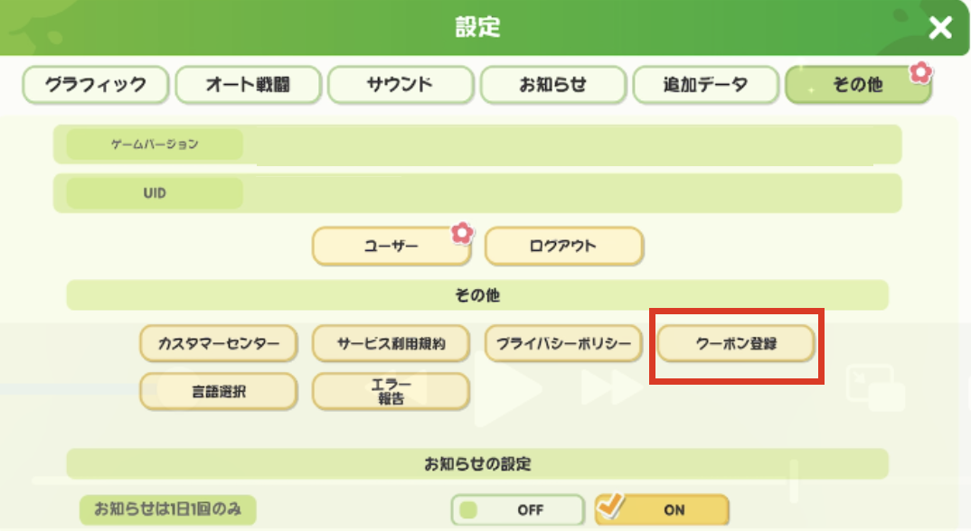 ②「設定」の中の「その他」タブの「クーポン登録」を選択
