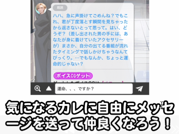 まるで実際の恋人とメッセージをやり取りするかのように、キャラクターと自由にテキストで会話をすることができます。