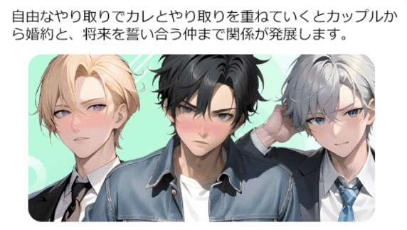 二次元の魅力的な男性キャラクターたちとリアルタイムで自由にチャット形式で会話を楽しみながら、恋愛ストーリーを進めていくことができます。