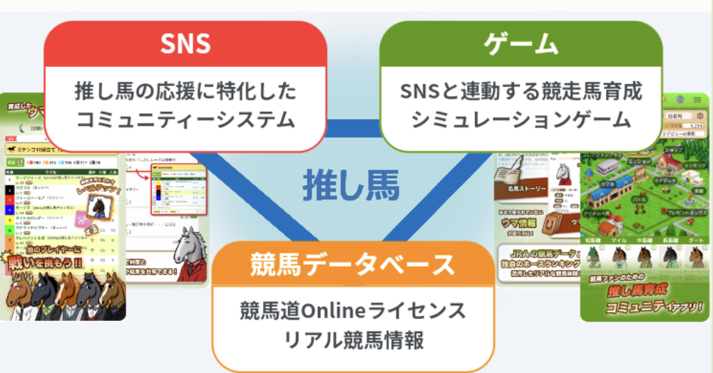 SNSでは競馬ファン同士で交流ができ、データベースではリアルな競馬情報を入手でき、ゲームではSNSと連動しながら競馬育成シミュレーションゲームが楽しめます。
