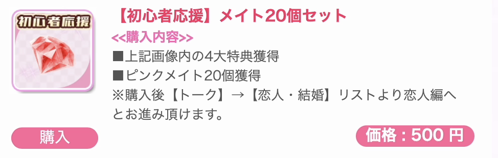 現時点(2026年4月13日時点)で一番安い課金メニューは500円で購入できる「初心者応援」メイト20個セットです。