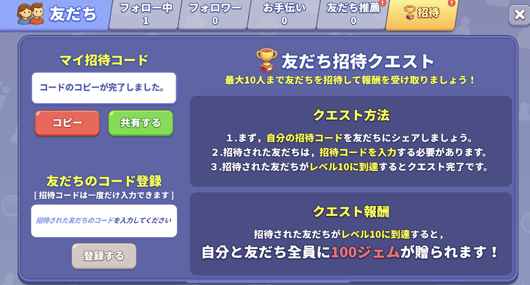 招待された友だちがレベル10に到達すると、自分と相手に100ジェムもらえます。