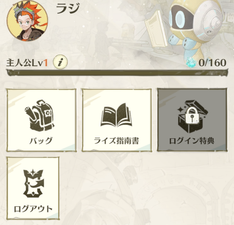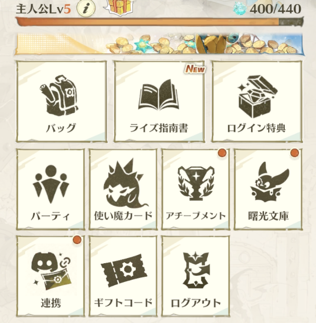 ↑こちらが主人公レベル5に到達した瞬間の「メニュー」画面です。項目がかなり増えています。レベル5に達した瞬間に「ギフトコード」の項目が追加されます。